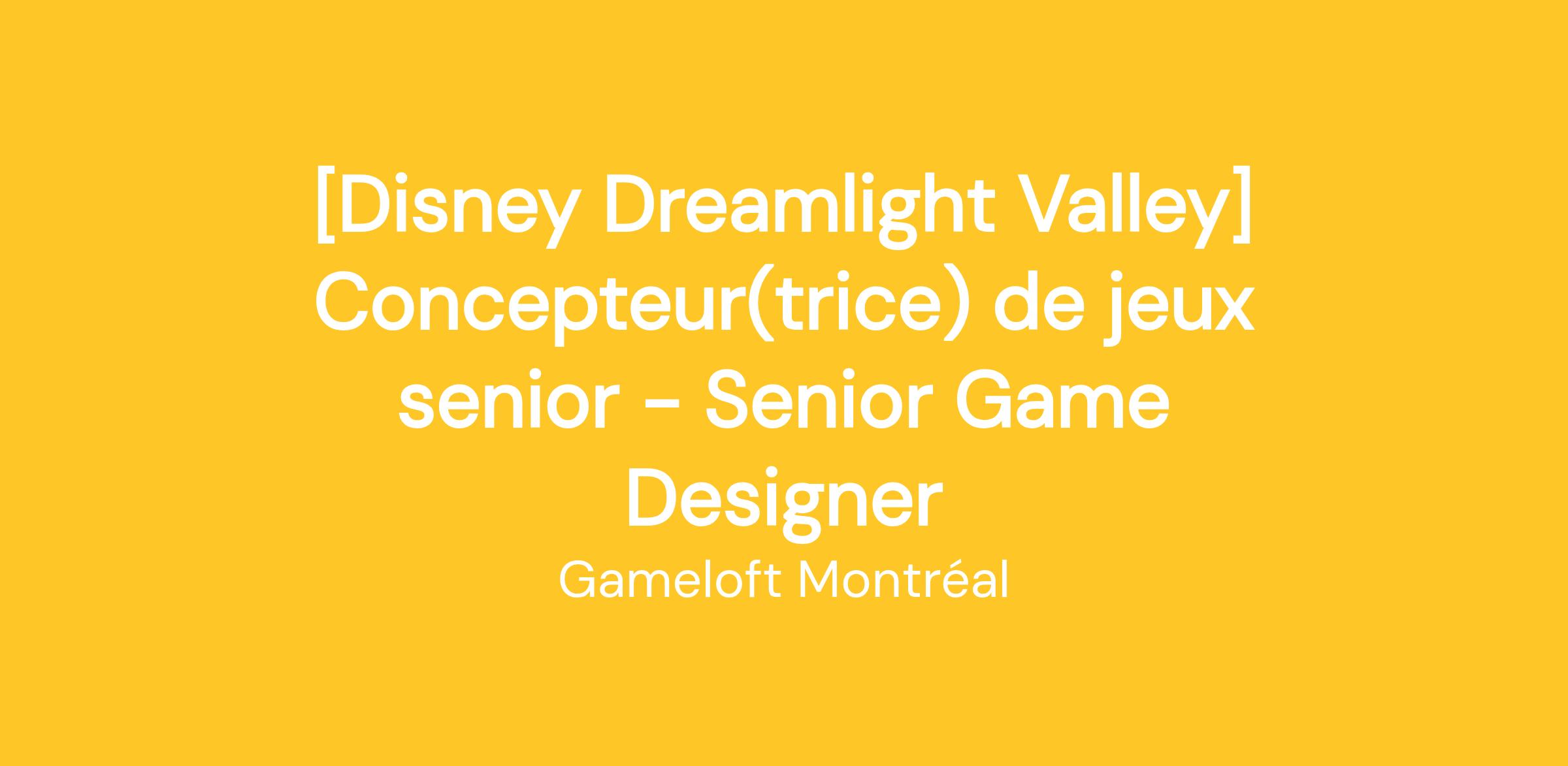 We are looking for a passionate and self-motivated senior game designer to join our Disney Dreamlight Valley design team. A brand cross-platform hybrid life-sim/adventure game already available! Rich with quests, exploration, and engaging activities featuring iconic Disney and Pixar friends, Disney Dreamlight Valley is a 100%-original Gameloft Montreal production, designed by a passionate team just waiting for you to join them!
