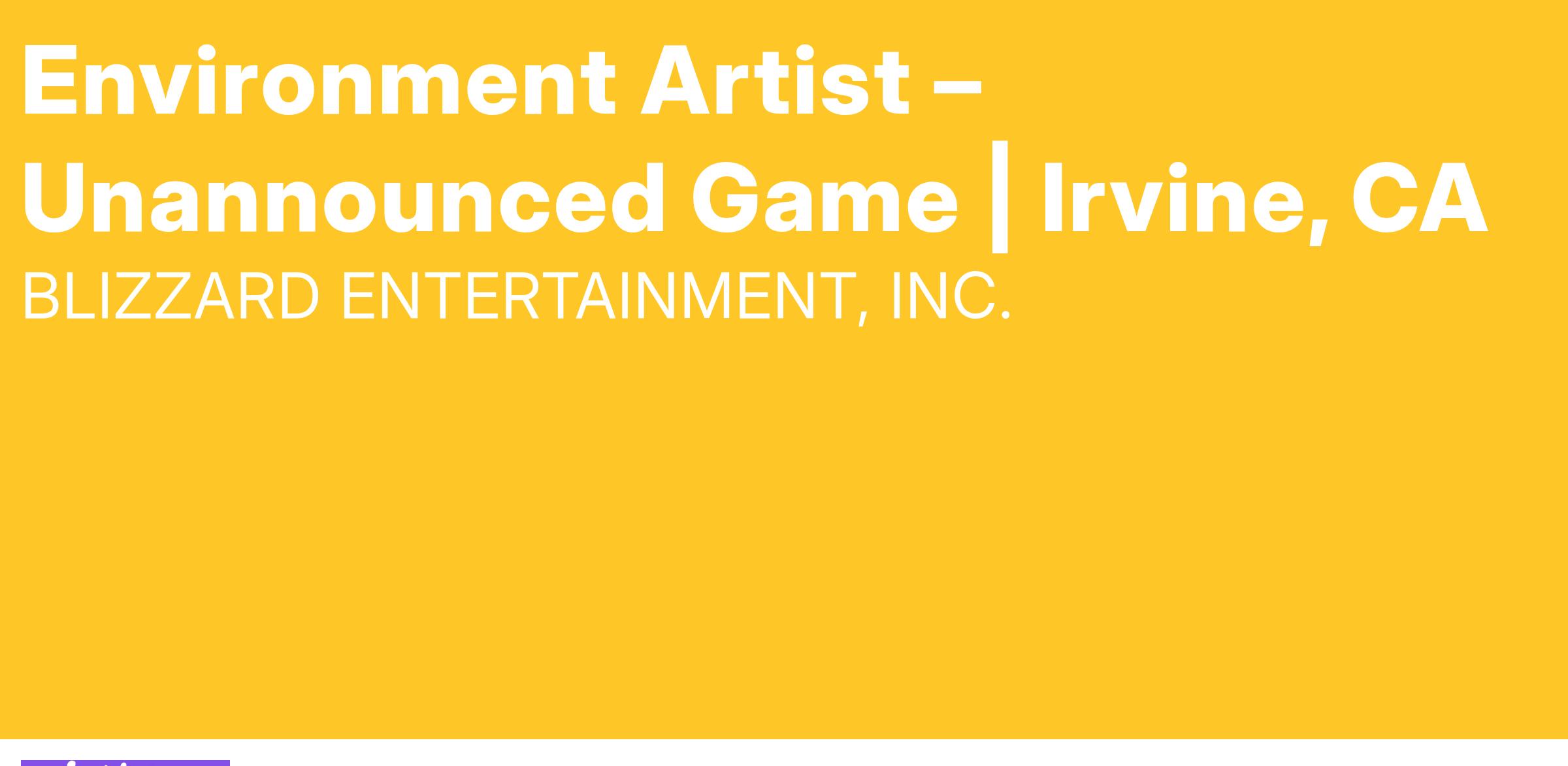 Unannounced ProjectAt Blizzard, we craft genre-defining games and legendary worlds for all to share. Through unparalleled creativity and storytelling, we create immersive universes and iconic characters that are beloved across platforms, borders, backgrounds, and generations - only made possible by building a work environment that nurtures the artistry of game development and unleashes the aspirations of our people.