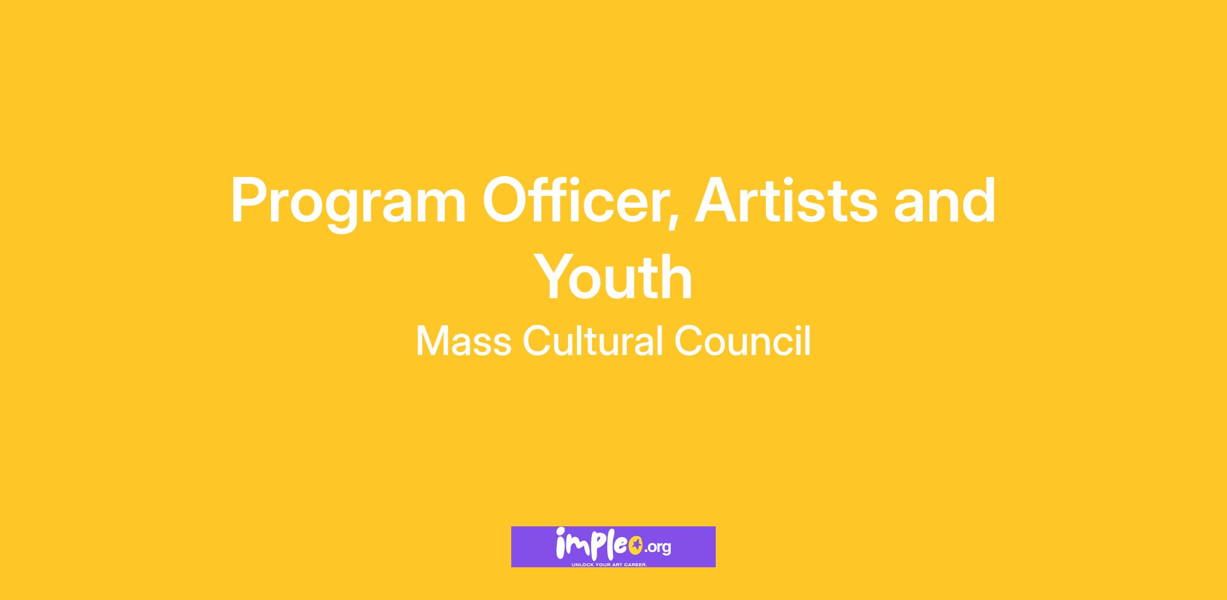 POSITION SUMMARY Artists and Youth: Massachusetts artists are at the heart of our rich cultural life. Using form, sound, color, language, and movement, artists help us interpret our past, understand the present, and envision a better future. Their work breaks down barriers and helps us appreciate what it means to be human. That’s why we believe that supporting artists and creativity is essential to our mission. Additionally, we want to ensure that culture plays a major role in the formation of creative, productive, and independent-minded young people in Massachusetts. We achieve this by supporting arts education, creative youth development, and fostering organizations and programs that bring culture to students across the Commonwealth. The Artists and Youth team supports the creative growth and development of individual artists, teaching artists, youth, and youth-serving organizations across the Commonwealth.