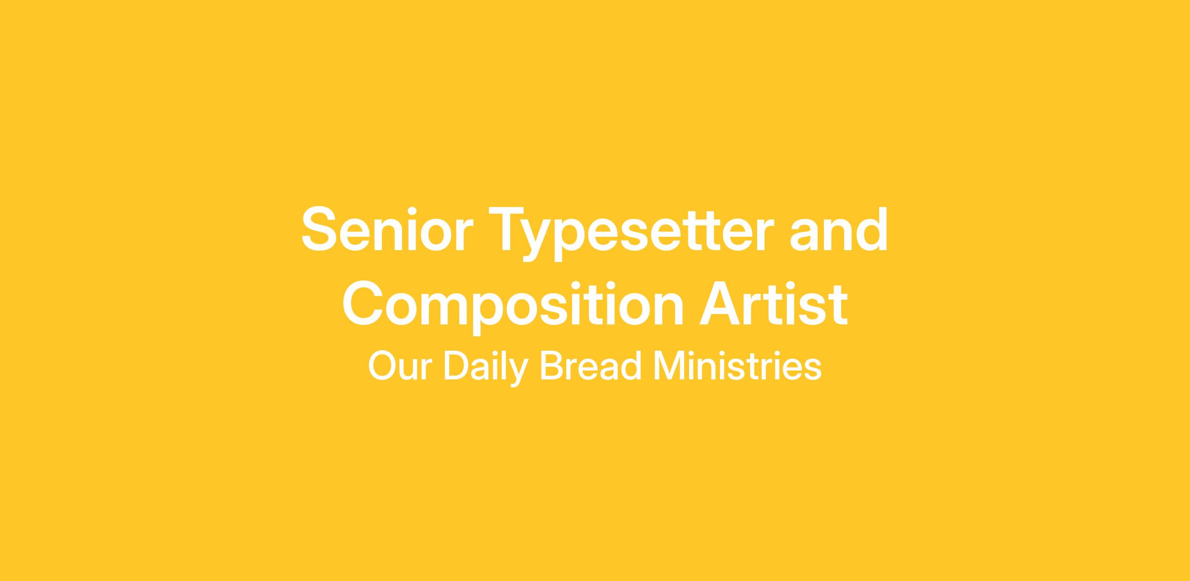 Our Daily Bread Ministries is seeking a Senior Typesetter and Composition Artist to lead the interior design, typesetting, and composition of print and publishing resources that support our global mission. This role plays a key part in ensuring our devotionals, booklets, and book projects are visually engaging, brand-consistent, and produced with excellence.
